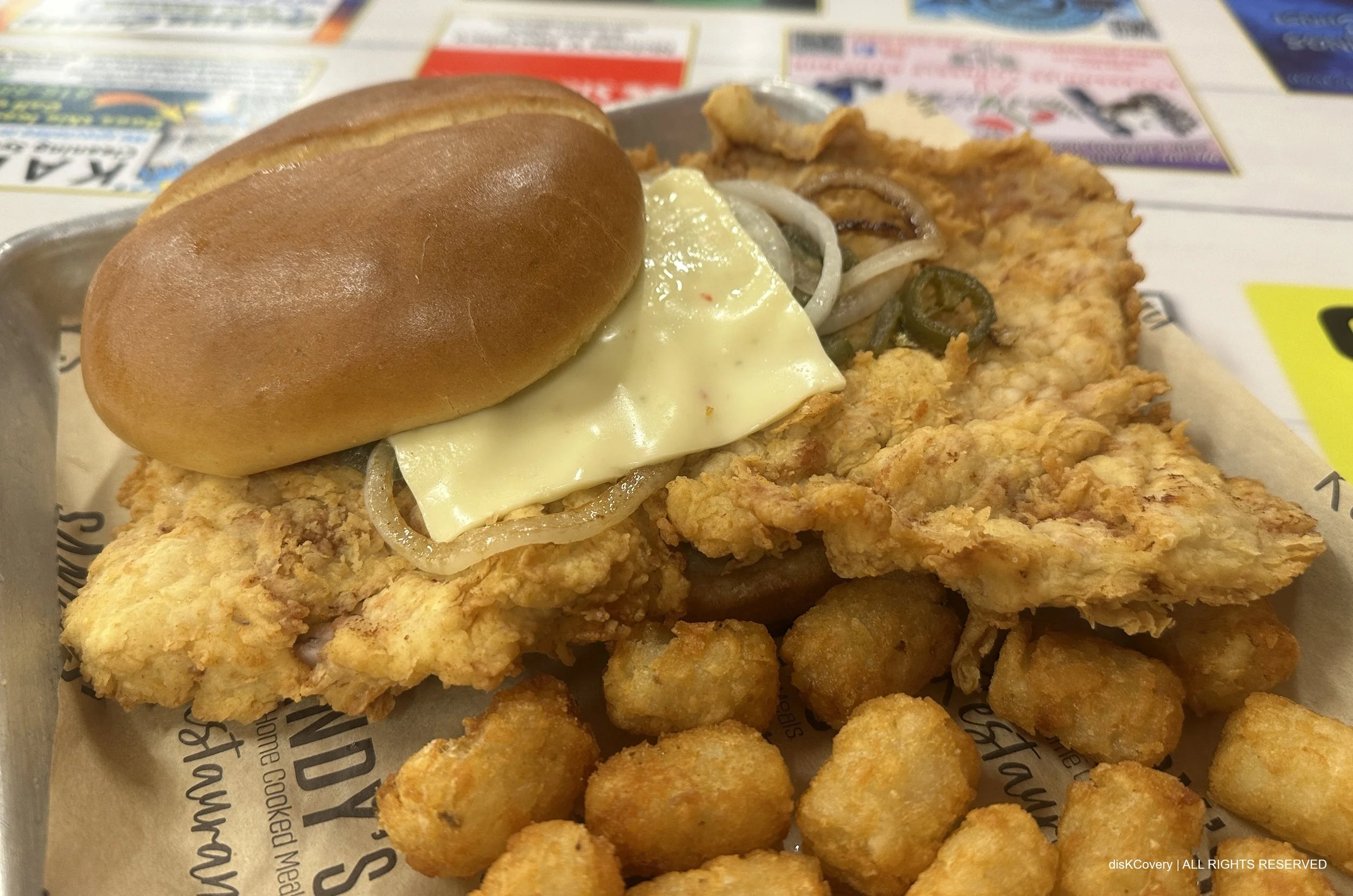 Double-breaded in Sandy’s original recipe flour, the golden orange tenderloin shows up all over the menu. You can order it for breakfast, open-faced, as a dinner plate, or in its classic sandwich form. Even then, the variations keep things interesting. The Hot Off the Pig comes piled with grilled onions, jalapeños, pepper jack cheese, and garlic aioli. The Cheesy As It Gets is smothered in cheese sauce and finished with loaded fries. No matter how you take your tenderloin, Sandy’s has got you covered.