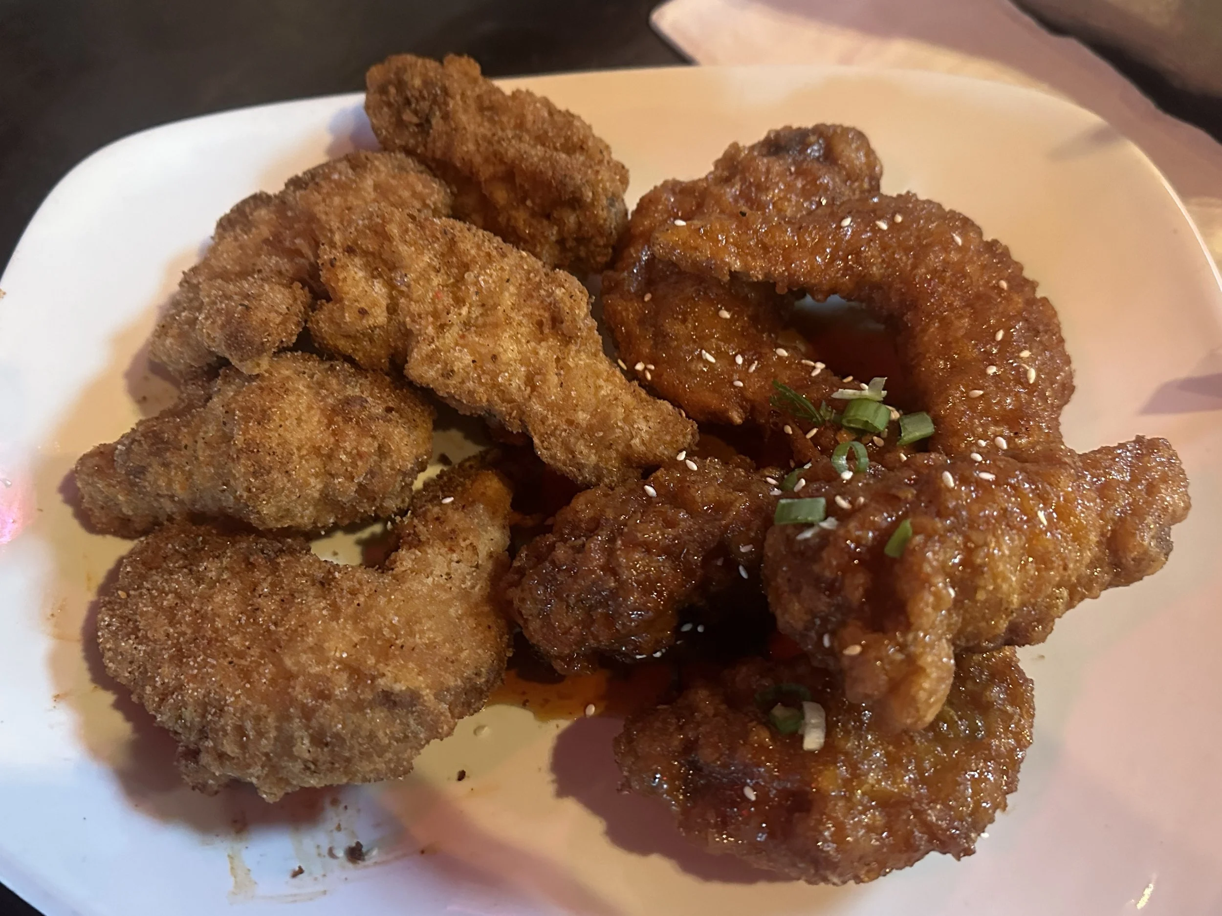 A mixed plate of Korean Fried Chicken from Kobi-Q. On the left, the Spicy Sichuan Dry Rub and on the right, the Sweet-Garlic Glazed. PHOTO CREDIT - disKCovery