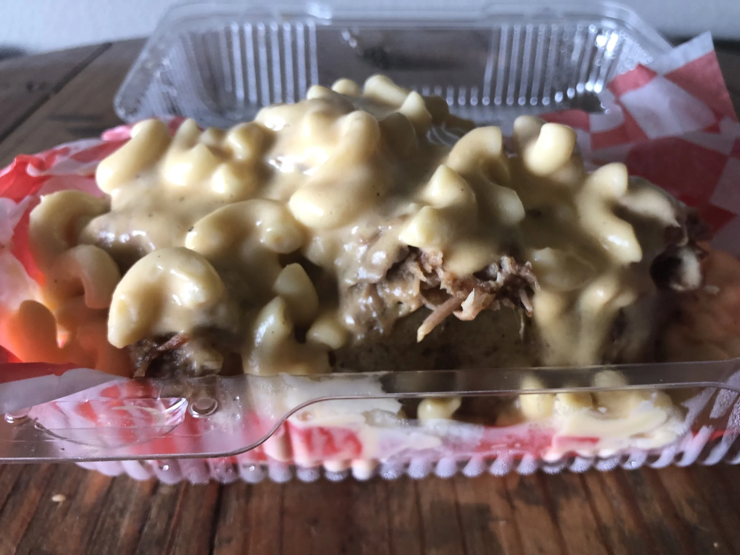 It may not look like much but Off the Hook BBQ’s simply named Baked Potato, topped with a meat of your choice and four-cheese mac, is tremendous. PHOTO CREDIT - disKCovery